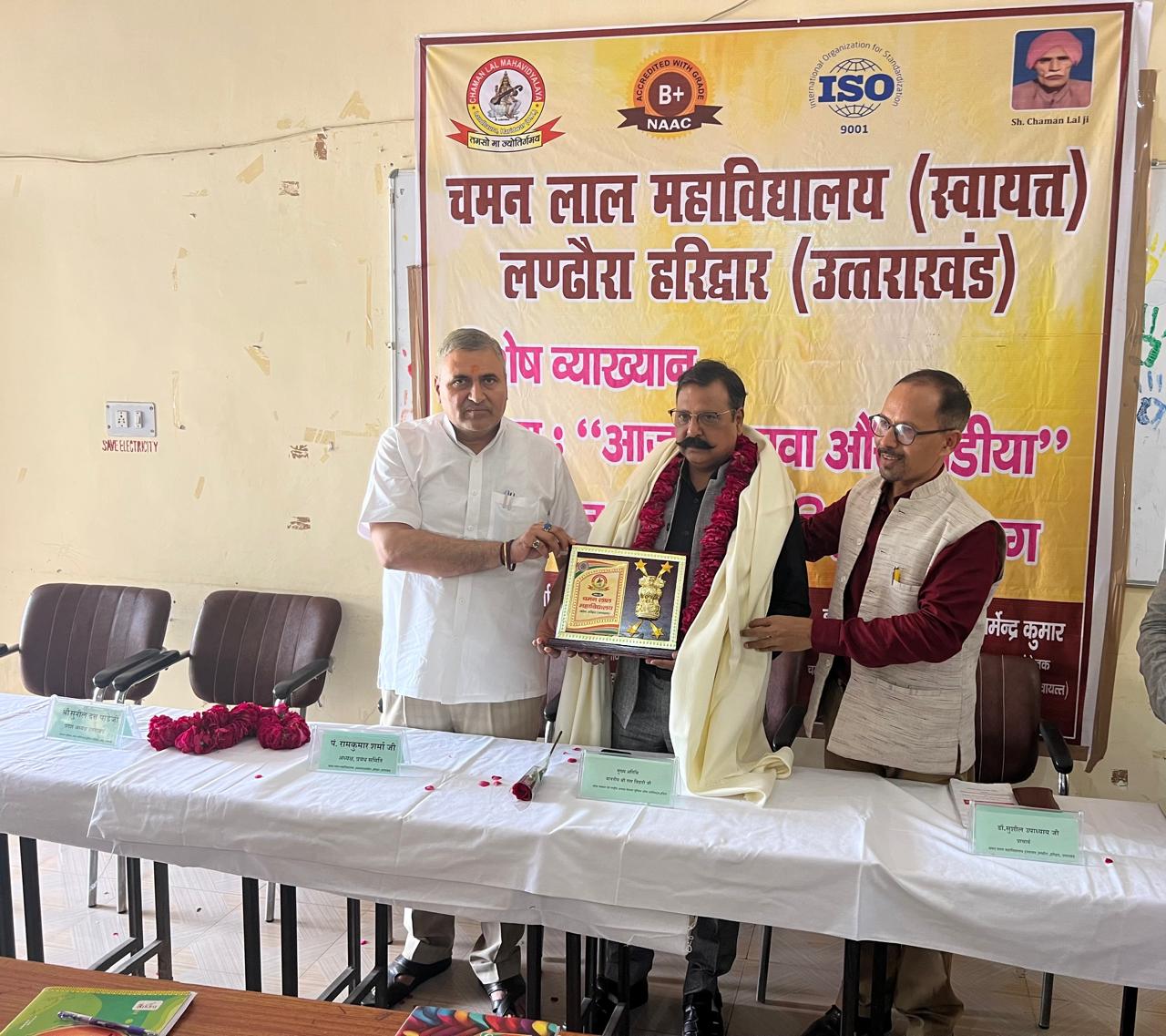 लंढौरा l चमन लाल महाविद्यालय में आज दिनांक 06 सितंबर 2025 को “आज का युवा और सोशल मीडिया” विषय पर एक विशेष व्याख्यान आयोजित किया गया।कार्यक्रम की शुरुआत मां सरस्वती के आगे दीप-प्रज्वलित कर की गई l तत्पश्चात महाविद्यालय प्रबंध समिति के अध्यक्ष रामकुमार शर्मा ने मुख्य अतिथि एवं विशिष्ट अतिथियों का मोमेंटो व शॉल भेंटकर स्वागत किया। कार्यक्रम के मुख्य अतिथि, वरिष्ठ पत्रकार एवं राष्ट्रीय अध्यक्ष (नेशनल यूनियन ऑफ जर्नलिस्ट्स इंडिया) माननीय रास बिहारी जी ने अपने संबोधन में कहा कि युवाओं को अखबार पढ़ने और समाचार देखने की आदत डालनी चाहिए। उन्होंने कहा कि देश-दुनिया में हो रहे परिवर्तनों से अवगत रहना आवश्यक है। साथ ही उन्होंने युवाओं को सोशल मीडिया के सही और जिम्मेदाराना उपयोग के प्रति प्रेरित किया। कार्यक्रम के मुख्य वक्ता सुनील दत्त पांडे जी ने कहा कि सोशल मीडिया आज युवाओं के लिए करियर निर्माण का एक बड़ा साधन बन चुका है बशर्ते इसका उपयोग सही दिशा और सकारात्मक विचारों के साथ किया जाए। आज के युवा वर्ग को यह भी ध्यान रखना होगा कि मीडिया का दुरुपयोग न होने पाए कुछ राजनीतिक पार्टियों इसका दुरुपयोग करती है इसके लिए भी कठोर कदम उठाने चाहिए l उन्होंने छात्रों से आग्रह किया कि वे गलत प्रवृत्तियों से दूरी बनाकर सोशल मीडिया को अवसर और विकास का मंच बनाएं। इस अवसर पर महाविद्यालय प्रबंध समिति के सचिव अरुण हरित ने अपने आशीर्वचन में कहा कि मोबाइल और सोशल मीडिया से केवल अच्छी और सकारात्मक बातें ग्रहण करनी चाहिए। उन्होंने छात्रों को जागरूक और संयमित रहने का संदेश दिया।